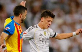 在灯光璀璨的伯纳乌球场,皇马与瓦伦西亚的...